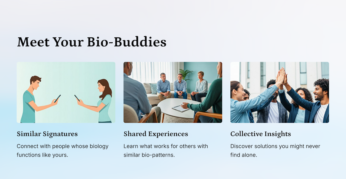 Match with bio-buddies who share your health profile. Find clinicians experienced with your specific needs.